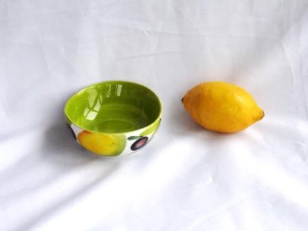 Kleine Schüssel für Joghurt, Müsli, Oliven oder Ähnliches, Außenseite mit Zitronen-Oliven-Dekor auf weissem Untergrund, Innenseite hellgrün mit sichtbarem Pinselstrich, Durchmesser ca. 11 cm, Höhe ca. 4,2 cm, geschwungener Rand. Spülmaschinenfest, mit ungiftigen Farben von Hand bemalt und glasiert.